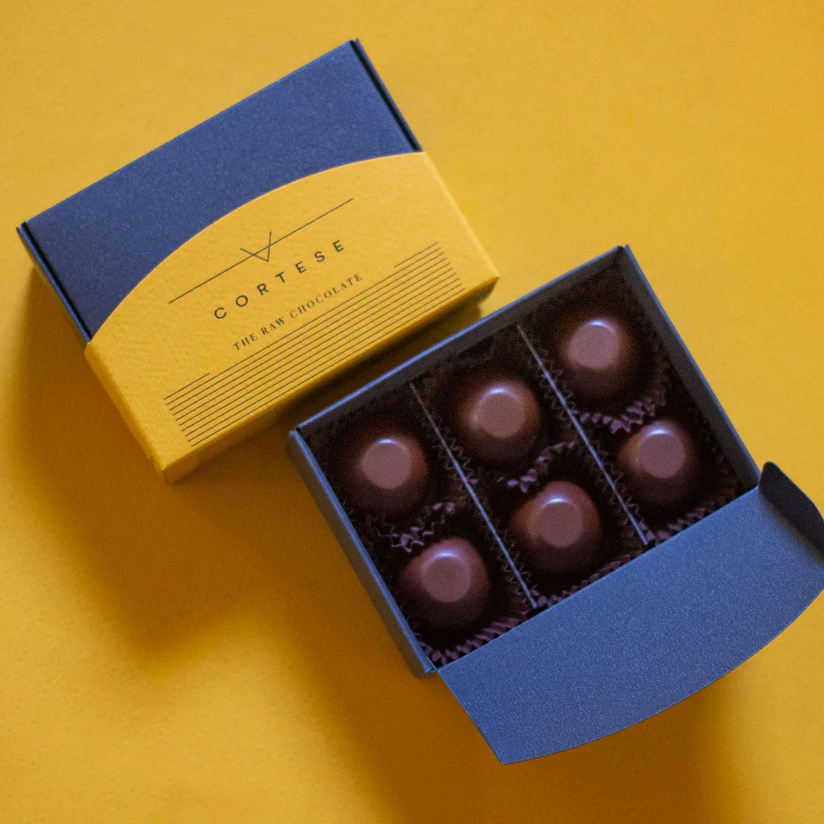 Una deliziosa cupola di cioccolato crudo croccante ben temperato che racchiude un cuore di intensa nocciola Bio. A completare l'opera una deliziosa riduzione al caffè. Indescrivibile.